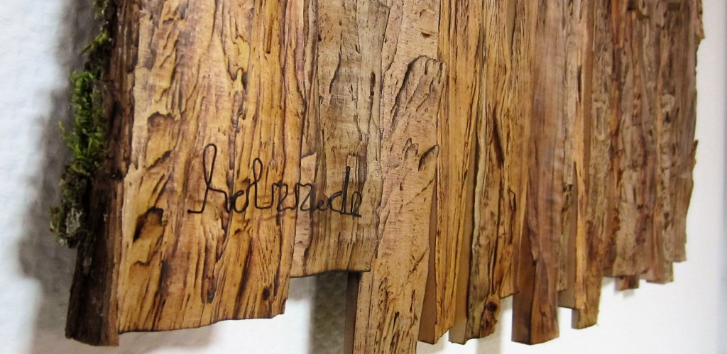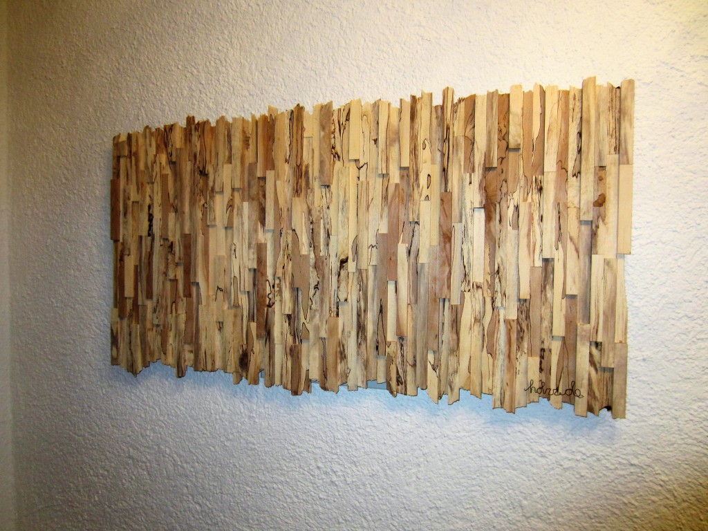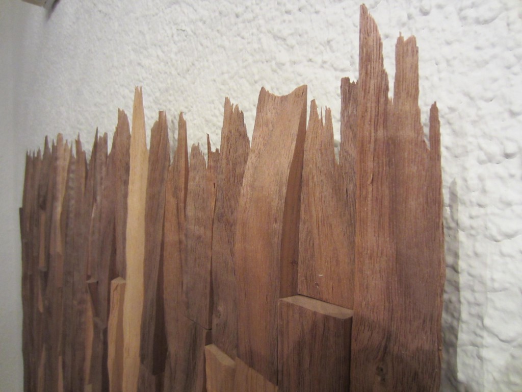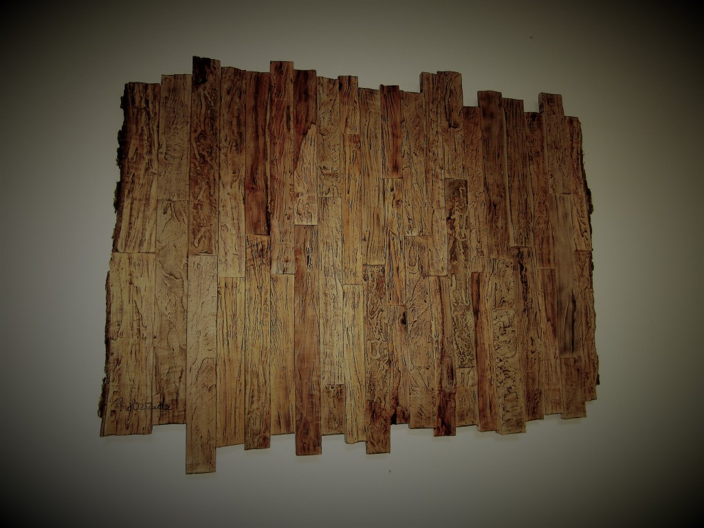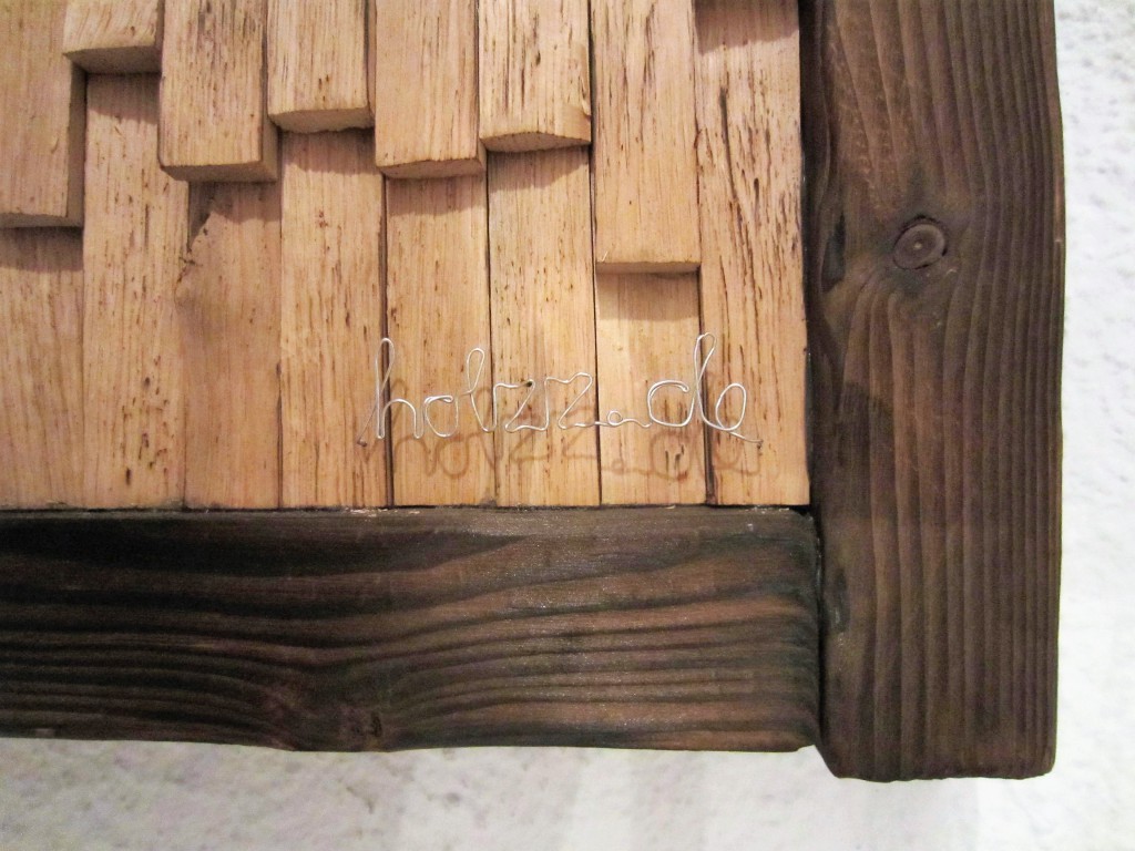 Wandbild in Eiche gespalten. Als Fischgrat verlegt. Umramt mit einem gebrannten Fichtenramen.
