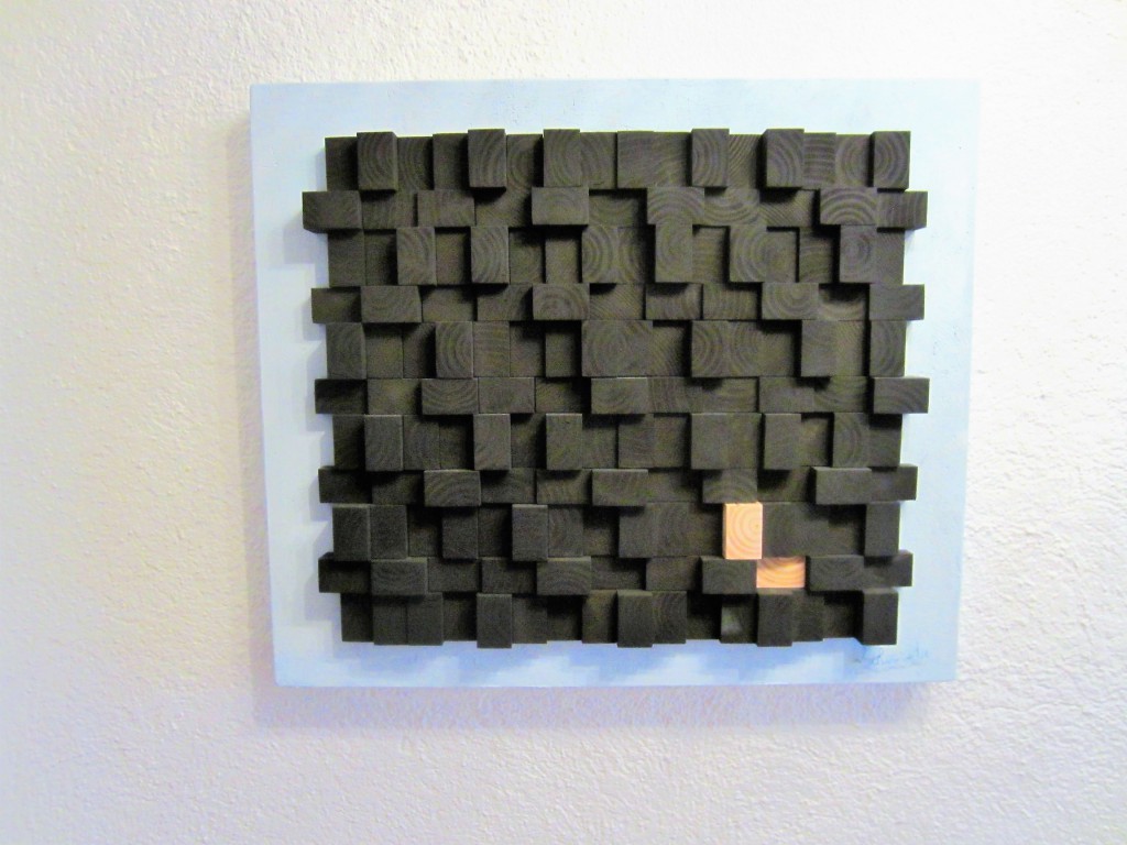 Mosaikwürfel schwarz lackiert mit Himmelblauem Hintergrund.